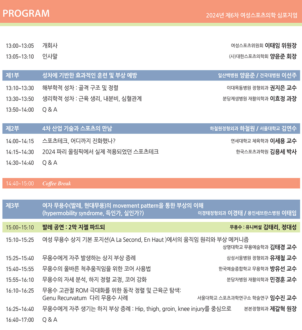 이번 심포지엄에서는 성별 효과적 훈련 및 부상 예방, 4차 산업 기술과 스포츠의학을 살펴보고 여성 무용수 부상을 과가동성 증후군 등 생리적 특성을 바탕으로 깊게 이해하는 시간을 갖게 됩니다. 여성 스포츠의학에 대한 뜻 깊은 독특한 시간이 되겠습니다.